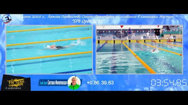 07.06.2025, Санкт-Петербург, Открытое летнее Первенство СПб по плаванию в категории "Мастерс" "SPb Open - 2025", эстафета 4x100 м вольный стиль, женщины, 4-я дорожка, команда СК "Фитнес Хаус" (ВК - 240-279) установила новый Рекорд России с результатом 5:45.05: - 1 этап - Эмилия Штодина - 2 этап - Алла Шпади - 3 этап - Светлана Филипповская - 4 этап - Наталья Шестакова - съёмка, монтаж: Николай Канаев