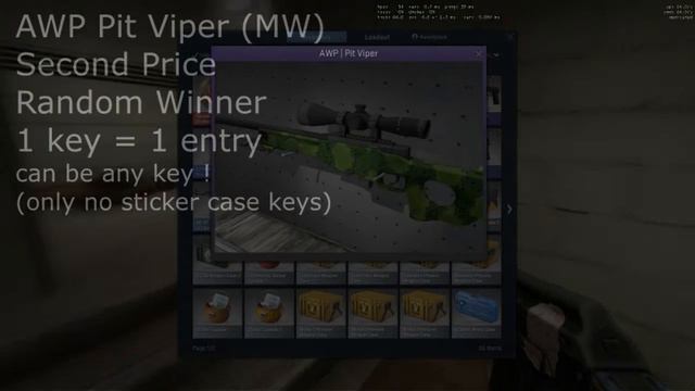 This is my first CS:GO Skin Raffle I will do more in the future! Trade Link to send the keys to: http://steamcommunity.com/tradeoffer/new/?partner=137670780&token=Ivm3Hhpf First Price : AK-47 Redline (FT) 1 Key = 1 Entry All keys are good (only NO sticker capsule keys) Second Place : AWP Pit Viper (MW) 1 Key = 1 Entry All keys are good (only NO sticker capsule keys) Third Place : *Stattrak USP-S Guardian (FT) Most Keys wins this Skin! All keys are good (only NO sticker capsule keys) Trade Link to send the keys to: http://steamcommunity.com/tradeoffer/new/?partner=137670780&token=Ivm3Hhpf