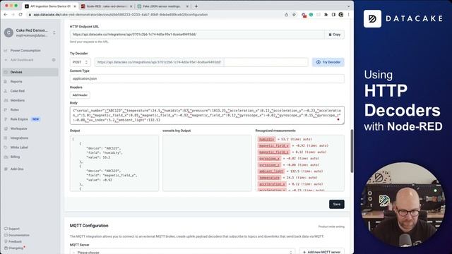 In this video, we will show you how to use API Devices and HTTP Decoder to forward JSON data to Datacake via Node-RED or any other platform. If you need to forward multiple measurements simultaneously, we will also demonstrate how to use API integration. By the end of this tutorial, you will have the knowledge you need to start forwarding JSON data to Datacake with ease. Node-RED Flow: https://gist.github.com/simmikolon/6a6e58497cb9599a5e44bd9bc70a627e Datacake Decoder: https://gist.github.com/simmikolon/61c0cb9c018cc1bc6141f24f38017857