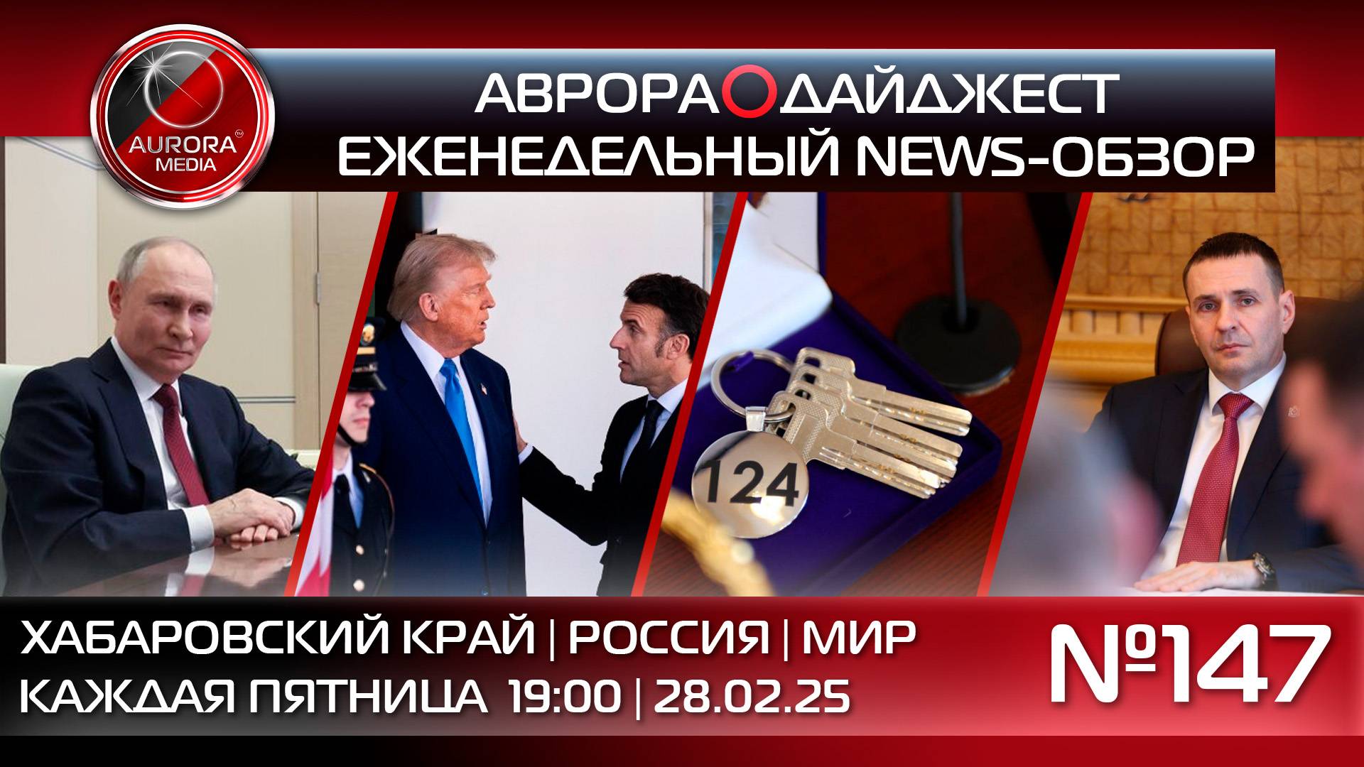 АВРОРА⭕️МЕДИА ЕЖЕНЕДЕЛЬНЫЙ ВИДЕО NEWS-РАЗБОР НЕДЕЛЯ | 21.02.2025 - 28.02.2025 АВРОРА⭕️ДАЙДЖЕСТ №147 Содержание: 0:00 Начало 0:30 В этом выпуске НОВОСТИ ХАБАРОВСКОГО КРАЯ 01:18 Дмитрий Демешин вручил ключи от квартир семьям участников СВО 01:54 В Хабаровске прошел первый краевой военно-патриотический форум "Защитник Отечества" 03:24 Совещание по вопросам развития спортивных клубов состоялось в краевом правительстве 04:18 Деловую программу Российско-Китайского форума обсудили на совещании с Фондом "Росконгресс" 05:25 Казаки Хабаровского края и Забайкалья отметили День защитника Отечества НОВОСТИ РОССИИ 06:28 Владимир Путин высказался о переговорах по Украине и совместных проектах с США 07:24 Правительство выделит 40 млрд рублей жителям Курской области НОВОСТИ МИРА 08:04 Совет безопасности ООН одобрил резолюцию «Путь к миру», предложенную США 08:53 Дональд Трамп и Эммануэль Макрон провели пресс-конференцию после встречи в Вашингтоне || Телеграмм-экосистема А⭕М: | АВРОРА МЕДИА @aurora_media https://t.me/aurora_media | АВРОРА НОВОСТИ @news_aurora https://t.me/news_aurora | АВРОРА ХАБАРОВСК @khv_aurora https://t.me/khv_aurora | АВРОРА ЛАЙФ @life_aurora https://t.me/life_aurora | АВРОРА СПОРТ @sport_aurora https://t.me/sport_aurora | АВРОРА ГЕРЛС @girl_aurora https://t.me/girl_aurora | АВРОРА ХАЙТЕК @ht_aurora https://t.me/ht_aurora | АВРОРА ПЕРСОНЫ @people_aurora https://t.me/people_aurora | АВРОРА ИНСАЙД @media_aurora https://t.me/media_aurora | АВРОРА КРИМИНАЛ @crime_aurora https://t.me/crime_aurora | АВРОРА МОЛОДОСТЬ @aurora_young https://t.me/aurora_young || Aurora_Media: | Российское Информационное Агентство | +7(4212)900-900 media@auroragroup.info | +7(909)800-71-11 messenger