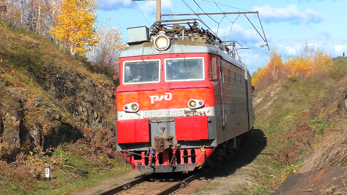 Электровоз ВЛ11-394 с грузовым поездом следует по перегону Алапаевск - Разъезд 132 км. Свердловская ЖД. Город Алапаевск, Свердловская область, Россия. Приписка: ТЧЭ-1 Смычка. 04.10.2020