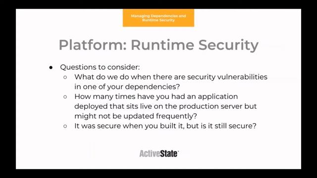 Download Datasheet Runtime Security: Remove Blindspots with Built-In Security, https://www.activestate.com/sites/default/files/pdf/solution-sheet-platform-runtime-security.pdf Introducing a zero-discipline way to secure Python by instrumenting your application once, typically during development, to enable security tracking for an application’s lifetime. You can: Monitor security wherever the application is run, from dev through test and into production; Track security for each of the application’s dependencies; Ensure security for long running/rarely updated applications. ------- Check out our Platform's beta - you can already build Python, Perl and Tcl runtimes for Linux and Windows plus Python for macOS. Use our powerful Beta and see for yourself: https://www.activestate.com/products/platform/