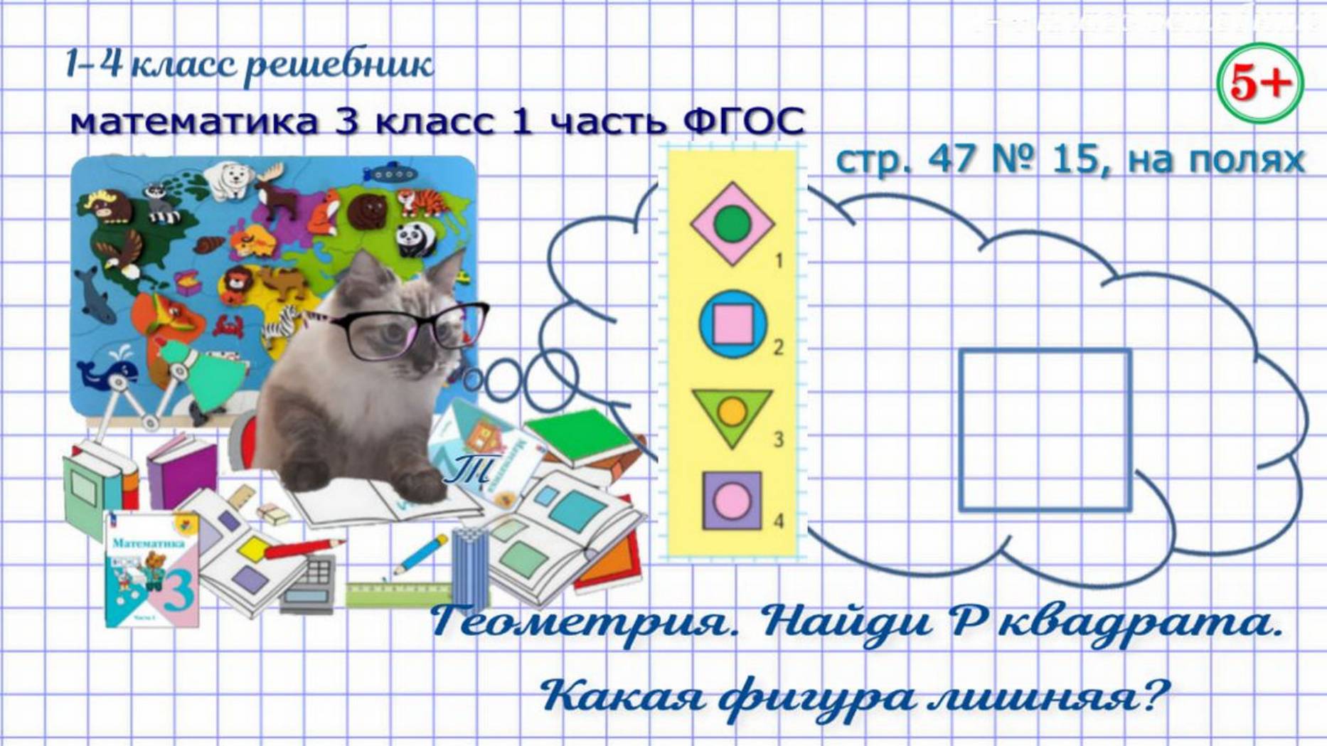 Стр. 47 № 15, на полях найди периметр квадрата, лишнюю фигуру математика 3 класс 1 часть ФГОС 2023