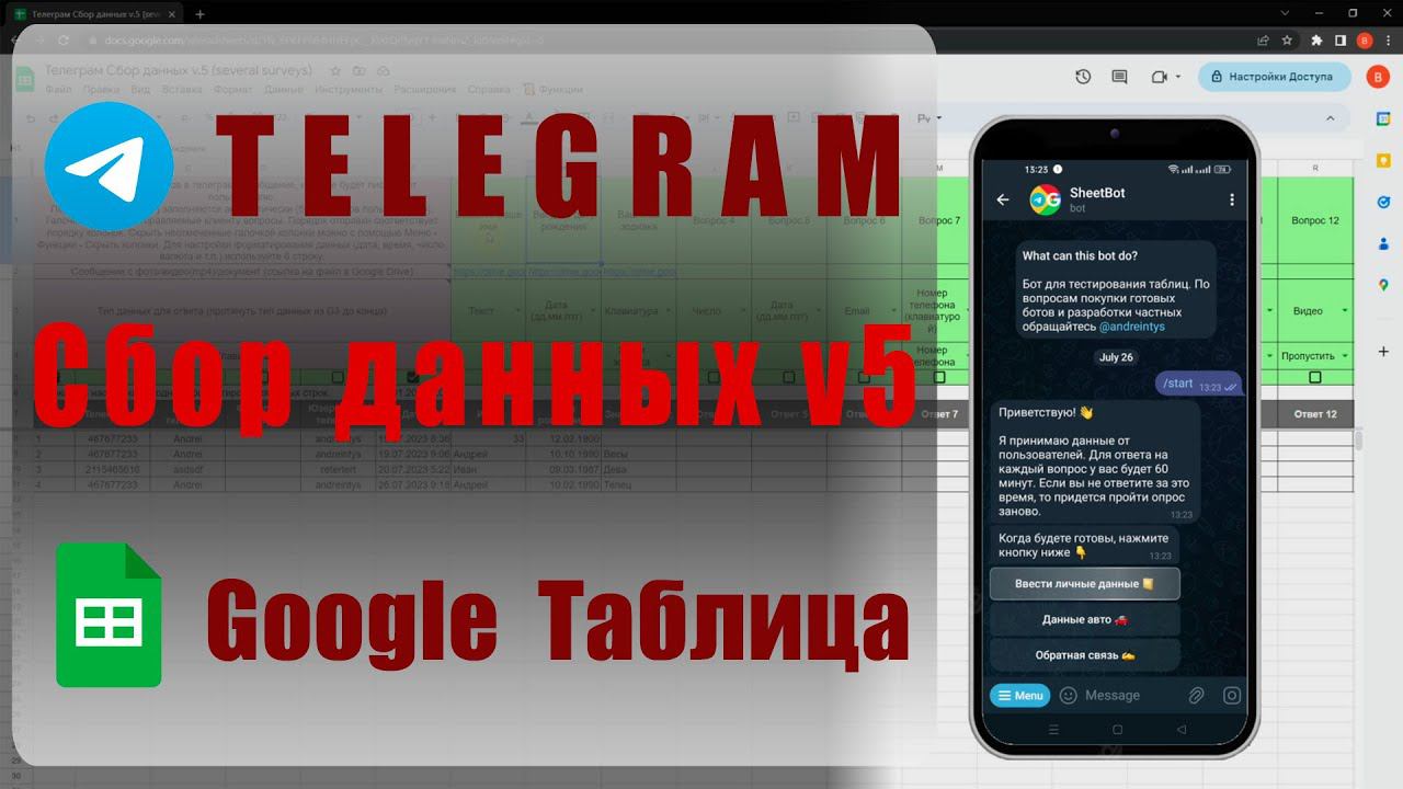 🤖 Протестировать бота https://t.me/my_sheetbot Это краткий обзор функционала полной версии таблицы по сбору данных через telegram бота. Главное отличие этой версии от предыдущей, что можно создать до 12 опросов и подключить их к одной google таблице и одному telegram боту. Все опросы линейные, не подразумевают вариантов в зависимости от ответа. Как и в предыдущей версии, в этой версии (v.5) пользователю можно задать неограниченное количество вопросов, запросить его номер и местоположение, отправить в вопросе фото/видео/документ, указать проверку вводимых данных, передать клавиатуру в вопросе, включить "белый" лист, принимать файлы от пользователя и сохранять их на google диск, отправлять отчеты о заполнении таблицы, делать рассылки. Вопросы, которые будет задавать бот пользователю, вы настраиваете самостоятельно. Также бот записывает telegram id, имя, фамилию и никнейм пользователей. Все работает полностью на бесплатных платформах (google и telegram). Никаких абонентских плат и т.п. Вы получаете полностью рабочий инструмент в свое распоряжение: таблица и код принадлежат вам после покупки. ©️ ✔️ Стоимость таблицы - 5999р Чтобы купить таблицу, заказать разработку телеграм бота или google таблицы для ваших нужд свяжитесь со мной в телеграм: https://t.me/andreintys Ссылка на обзор полного функционала таблицы https://youtu.be/gvPTMxZb4J0 Другие продукты https://sheetbot.ru/ Обучающие видеоуроки по созданию чат ботов телеграм в плейлисте https://youtube.com/playlist?list=PLkg5Sg9aqn7WQLfO0rEN7Q7mhuQiQ4XK4 Вопросы можно задать в группе телеграм: https://t.me/googlesheetstelegram 00:00 - Вступление, краткое описание 00:28 - Первый опрос (Личные данные) 00:44 - Данные авто 01:07 - Обратная связь 01:18 - Настройки и ссылки