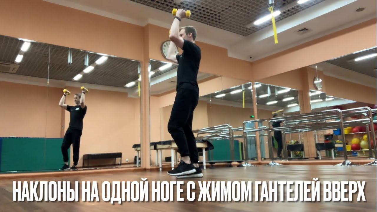 Наклоны на одной ноге с жимом гантелей вверх