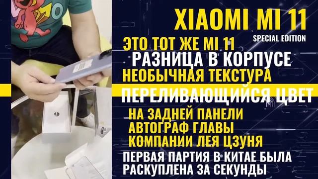 Xiaomi Mi 11 Special Edition. Её первая партия разлетелась в Китае за секунды. По сути, это тот же Xiaomi Mi 11, но только с корпусом с необычной текстурой и переливающимся цветом, а также с автографом главы компании Лея Цзуня (Lei Jun) на задней панели.
