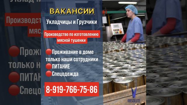 ВНИМАНИЕ ВАКАНСИИ! Работа вахтой, Рязанская область, г.Скопин Производство мясной тушенки ✔️ Питание (сытный обед) - Бесплатно. ✔️ Перекуры каждые 2-2,5 часа. ✔️ Спецодежда выдаётся Бесплатно ✔️ Еженедельные авансы по четвергам 3000 рублей. По всем условиям работы, бронированию места на производстве обращайтесь в ОТДЕЛ КАДРОВ 👇🏻 ☎️ 89197667586 (WhatsApp, Viber) http://wa.me/79197667586 ☎️ 89772511123 (WhatsApp, Viber) http://wa.me/79772511123 Наш Телеграмм канал с видео о работе и отзывами сотрудников: 👉🏻 РАБОТА.ВАХТА.АБСОЛЮТ 👉🏻 🤳🏽 https://t.me/vahta_ok Страничка ВК: https://clck.ru/39yBwc Страничка в ОК: https://clck.ru/39yC23 #тольятти #ульяновск #нижнийновгород #челябинск #краснодар #кемерово #новокузнецк #альметьевск #липецк #тверь #иваново #нижнийтагил #курган #армавир #абакан #майкоп #калуга #смоленск #таганрог #златоуст #копейск #железногорск #ростов #елец #крым #нижнекамск #орск #арзамас #саранск