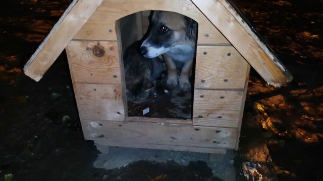 Кошка потеряла страх, пёс с виноватым видом прячется от дождя в своей будке