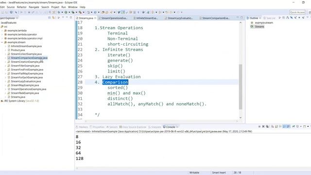 1.Stream Operations Terminal Non-Terminal short-circuiting 2. Infinite Streams iterate() generate() skip() limit() 3. Lazy Evaluation 4. Comparison sorted() min() and max() distinct() allMatch(), anyMatch() and noneMatch().