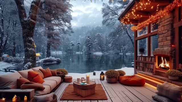 Нежная джазовая музыка рядом с теплым камином. Уютная атмосфера крыльца на берегу озера.