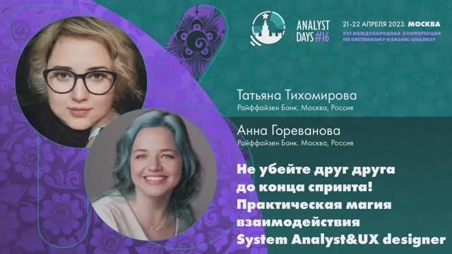 Татьяна Тихомирова, Анна Гореванова, Не убейте друг друга до конца спринта! Практическая магия взаимодействия System Analyst&UX designer Системные аналитики, как часто вы сталкивались с тем, что вообще не понятно, как ставить задачу дизайнеру? Когда говоришь дизайнеру «надо сделать красиво», а он не хочет? Дизайнеры, как часто вы сталкивались с тем, что вам с какой-то стати ставит задачи системный аналитик? Говорит «нарисуй вкладки красиво». Да кто он вообще такой, этот ваш системный аналитик?! Кажется, такие вопросы стали появляться не так давно и не только у нас. Мы посмотрели на себя, поспрашивали у других и поняли, что реальность изменилась. Но не сразу поняли, как работать вместе. А теперь нам есть, что рассказать: Как разграничить обязанности аналитика и дизайнера. Как построить процесс взаимодействия, чтобы была синергия. Как не мешать друг другу, а помогать и поддерживать в стремлении к звёздам. Наш доклад будет полезен тем, кто хочет не просто уживаться с коллегами, а стремится: Повысить качество продукта в «кровавом Enterprise»; Повысить свой уровень как профессионала; Делать больше, чем хочет бизнес.