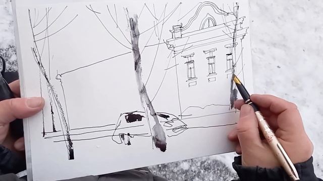Городская зарисовка пером зимой на пленэре 08.01.2023, Иркутск, —7°С #UrbanSketching #Pen #Ink