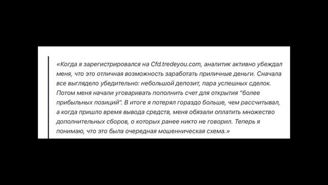 Обзор брокера TradeYou (tredeyou.com, cfd.tredeyou.com), реальные отзывы обманутых трейдеров. Это очередной псевдоброкер? Как вернуть деньги от TradeYou? Помогите мне если вы стали жертвой финансовых мошенников: брокеров, казино, подставных криптобирж или купили онлайн-курс, который не оправдал ожиданий, свяжитесь со мной в телеграме https://t.me/DengiVernite