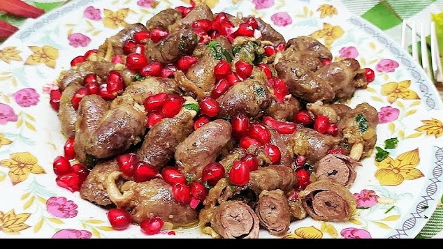 РЕЦЕПТ: Куриные сердечки-500гр, Сливочное масло-30гр, Луковица-1шт, Чеснок-4зубка, Кинза-5гр, Гранат-1/4, Растительное масло для обжарки, Кориандр-1/3 ч.л, Черный перец1/3ч.л., Соль по вкусу.