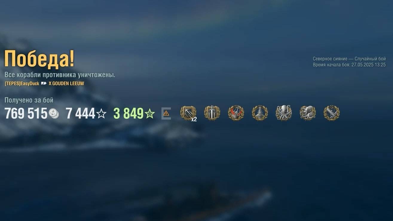 Крейсер Gouden Leeuw. Игрок: EasyDuck (EU). Карта: Северное сияние - Случайный бой. Урон: 222к. Gouden Leeuw - Крейсер Франции 10 уровня.