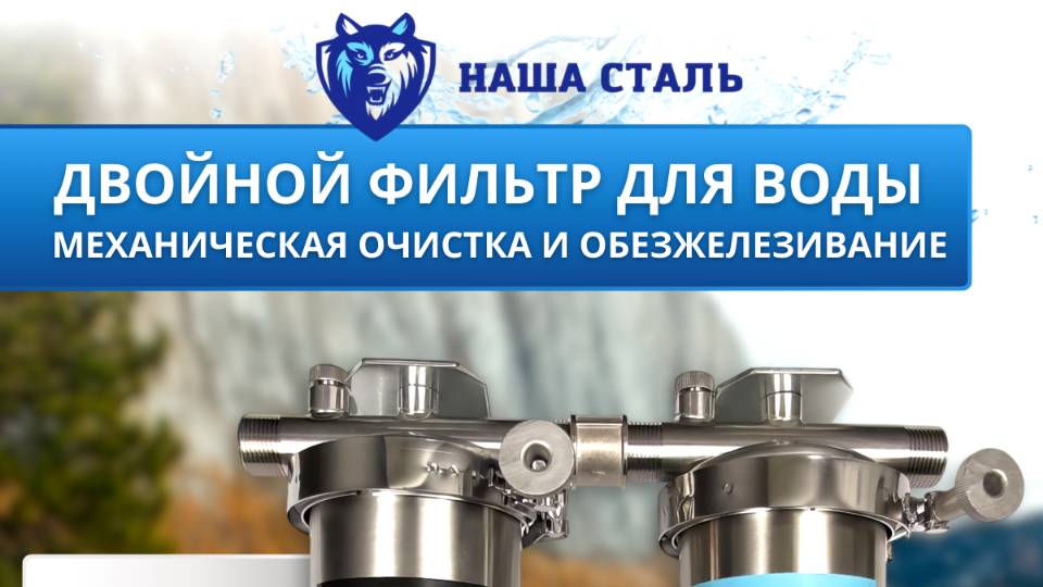 Двойной фильтр для воды НАША СТАЛЬ состоит из двух ступеней очистки. Ступень 1: Промывной сетчатый магистральный фильтр грубой механической очистки воды "СУПЕРСТАЛЬ" SL10, 5 микрон из нержавеющей стали, используется как первая или предварительная ступень очистки воды от механических примесей ПРЕИМУЩЕСТВА: · СУПЕР НАДЕЖНЫЙ И ДОЛГОВЕНЧЫЙ, ПРОДУКТ ЯВЛЯЕТСЯ ГОРДОСТЬЮ КОМПАНИИ · Фильтр изготовлен из нержавеющей стали (марка AISI 304) по международному стандарту SL 10 (Slim Line 10) · Используется на холодной и горячей воде · Высокая пропускная способность от 15 л/мин (может меняться в зависимости от давления в системе и степени загрязнения воды) · Сетчатый картридж 5 микрон грубой очистки воды из нержавеющей стали не требует замены. По мере загрязнения картридж промывается и используется дальше (Срок службы картриджа неограничен) · Эффективная очисткой воды от песка, глины, ила, тины и других нерастворённых в воде частиц (взвесей) · Высочайшее качество изделия ТЕХНИЧЕСКИЕ ХАРАКТЕРИСТИКИ: · Размер присоединения 3/4 дюйм (внешняя резьба), · Отверстие для установки манометра ¼ дюйма · Дренажное отверстие ½ дюйма (для установки сливного крана и удобной промывки) · Высота колбы: 384 мм · Диаметр колб: 90 мм · Монтажное расстояние: 140 мм · Стандарт фильтрующего картриджа: SL10 (Slim Line 10) · Максимальное рабочее давление: 6 атм (пиковая нагрузка до 8 атм). · Подходит для любых видов магистральных и проточных труб ГДЕ ИСПОЛЬЗУЕТСЯ СЕТЧАТЫЙ ФИЛЬТРУ ГРУБОЙ МЕХАНИЧЕСКОЙ ОЧИСТКИ "СУПЕРСТАЛЬ": · Как входной магистральный фильтр в квартиру, на дачу или частный дом · На любом объекте с возможностью установки фильтра стандарта SL10 · Для очистки воды в скважине, колодце или для водопроводной воды Ступень 2: Обезжелезивающий фильтр для очистки воды магистральный, торговая марка НАША СТАЛЬ, размер присоединения 3/4 дюйма. Фильтр изготовлен из нержавеющей стали AISI 304 по международному стандарту SL10 (Slim-line 10/Слим Лайн 10) Фильтр для обезжелезивания воды устанавливается как как одна из основных ступеней водоочистки для удаления из воды железа и марганца. Внутри колбы магистрального фильтра установлен фильтрующий элемент с сорбентом АС/МС, предназначенный для очистки воды от металлов. Ресурс картриджа зависит от степени загрязненности воды. По мере истечения ресурса сменный картридж подлежит замене на аналогичный или любой другой стандарта SL10. Картридж с обезжелезивающей засыпкой можно использовать на холодной воде. Пропускная способность картриджа зависит от давления в системе, от 8 л/мин Магистральный фильтр обезжелезивания воды Slim Line 10 предназначен для установки любых фильтрующих картриджей аналогичного стандарта всех доступных производителей на рынке РФ. Например: картридж механической или грубой очистки, картридж для умягчения воды, картридж для удаления железа из воды и другие…. Нержавеющая сталь (нержавейка) позволяет использовать фильтр-обезжелезиватель на холодной воде, а удобное крепление, позволяет надежно фиксировать изделие на разных поверхностях снижая нагрузку на магистральные и проточные трубы. Колба фильтра обезжелезивателя воды имеет размер присоединения 3/4 (внешняя резьба), специальное отверстие на ¼ дюйма для установки манометра и дренажное отверстие ½ дюйма для установки сливного крана для удобной промывки корпуса фильтра. Варианты установки об