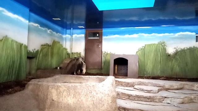 Пара гигантских муравьедов прибыла в Новосибирский зоопарк в 2020 году из зоопарка города Нюкеебинг-Морс (Дания). Наших гигантских муравьедов зовут Калле и Майя. Пара была сформирована несколько лет назад, у них уже рождались детеныши. 11 марта 2022 года родился детеныш краснокнижного гигантского муравьеда у нас в зоопарке. Их купают под душем в соседней комнате. Гигантский муравьед — самое крупное животное в отряде неполнозубых, длина его тела составляет 110-130 см. У него нет зубов, а язык достигает в длину 60 см — он нужен муравьеду для добычи корма. Животное разрушает термитники и муравейники, и языком, смоченным липкой слюной, быстро собирает насекомых. Кормят муравьеда однородной смесью фруктов, геркулеса, личинок насекомых, собачьего корма, торфа и других компонентов. Спит до 16 часов в сутки. Ходить по земле, имея такие длинные когти, трудно, и муравьеды вынуждены подгибать когти и опираться на тыльную сторону передних лап. Когтями легко защищается от врагов — одним ударом лапы большой муравьед способен выпотрошить собаку или даже убить человека и ягуара. В неволе живут до 14 лет. Самки муравьеда носят на спине единственного детёныша и не расстаются с ним от рождения до следующей беременности. Благодаря окраске, схожей с материнской, детёныш почти незаметен. Половозрелыми становятся через 2,5—4 года. Малыш уехал в Краснодар в "Сафари-парк".