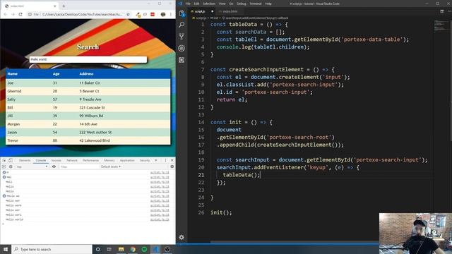 In this tutorial we create a search bar widget that will allow you to search through any HTML data table with the proper HTML structure. You will be able to use this in your future apps as well. #VanillaJS #learntocode #javascript Link to code: https://github.com/Zackazt/TableSearchBarTutorial Array filter video: https://www.youtube.com/watch?v=jmGS9YTAcZA Array map video: https://www.youtube.com/watch?v=LFELwK3WPjE If you would like to support me on Patreon: https://www.patreon.com/portexe Follow me on social media! Links on my website: https://www.portexe.com/ Intro Music By: GhostxMachine