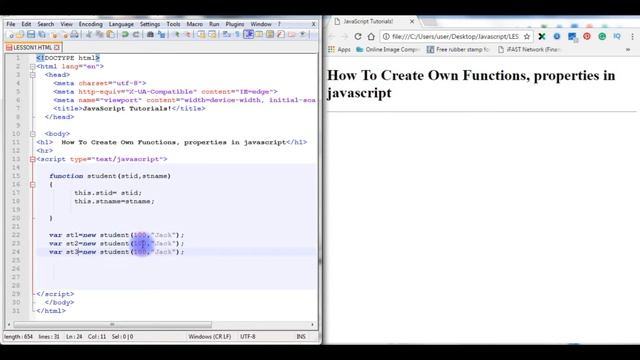 Javascript tutorial part 4 video lesson on how to create our own custom constructor functions, objects & properties