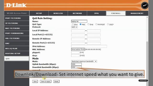 D-Link DIR-650 Router Bandwidth control settings (QoS) Set speed limit for any wired/wireless users by using their (unique) MAC address. Buy it from amazon *DIR-650IN https://amzn.to/3jXje8P *D-Link DIR-825 AC 1200 Wi-Fi Dual-Band Gigabit USB:- https://amzn.to/3ffTPD6 #dlinkrouter #dir650in #speedtest #bandwidth #agtinfo2u #agt D-Link Dir-650IN Wi-Fi Bandwidth Control (Set Speed Limit for Wi-Fi users) https://youtu.be/haVH6ENS7p8 D-Link DIR-650IN Bandwidth Control | Set Speed Limit for Group of User (Method 2) https://youtu.be/MsQtUla1LOc D-Link DIR-650IN Internet & Wireless Network Setup PPPoE / Static (Advanced Mode) https://youtu.be/AsmcIxBzzC4 D-Link DIR-650IN Setup As Wireless Repeater / Range Extender (Easy Setup) https://youtu.be/Tx399sqd8nA D-Link DIR-650IN Static IP Reservation Settings (Give Permanent IP Address) https://youtu.be/EiRVPXWFi9I Errorrr??? Your Router not connecting to the internet???? watch video.. https://youtu.be/8jIcJ-7FaLA Any Router setup as wired range extender/repeater (DSL / ADSL router):- https://youtu.be/cxaWI-6ZLmY @Watch more videos ASUS Router All Settings Playlist:- https://www.youtube.com/playlist?list=PLVDfTZrOdJzQnfk3DJrz0iJcvo7YLKGlp D-Link Router All Settings Playlist:- https://www.youtube.com/playlist?list=PLVDfTZrOdJzR6ixRoKuxbHvRWBnl_FT0a Tenda N301/N300 Router All Settings PlayList:- https://youtube.com/playlist?list=PLVDfTZrOdJzShwvri7BDFH-HJql6xElgx TP-Link Router All Settings Playlist:- https://www.youtube.com/playlist?list=PLVDfTZrOdJzQPJD9g2qX4hGGnzO9834Yr Mi Router All Settings PlayList:- https://www.youtube.com/playlist?list=PLVDfTZrOdJzRJZqD_juFNbAZAoymk_x_N Mercusys Router All Settings Playlist:- https://www.youtube.com/playlist?list=PLVDfTZrOdJzSmGjkxdfPleGinCHh36nTf Tenda Router Settings Playlist:- https://www.youtube.com/playlist?list=PLVDfTZrOdJzTQ4YNO51KXIVMxrx0WLWHV Watch More Video:- TP-Link PharOS CPE Configuration all Videos:- https://www.youtube.com/playlist?list=PLVDfTZrOdJzTbnmetgA-p_384-7fEzxuR Ubiquiti M5 / M2 Devices Configuration all Videos:- https://www.youtube.com/playlist?list=PLVDfTZrOdJzTpRO08aVDxYk5gJA8m0Yfs Subscribe for Latest Update Thank You For Watching..