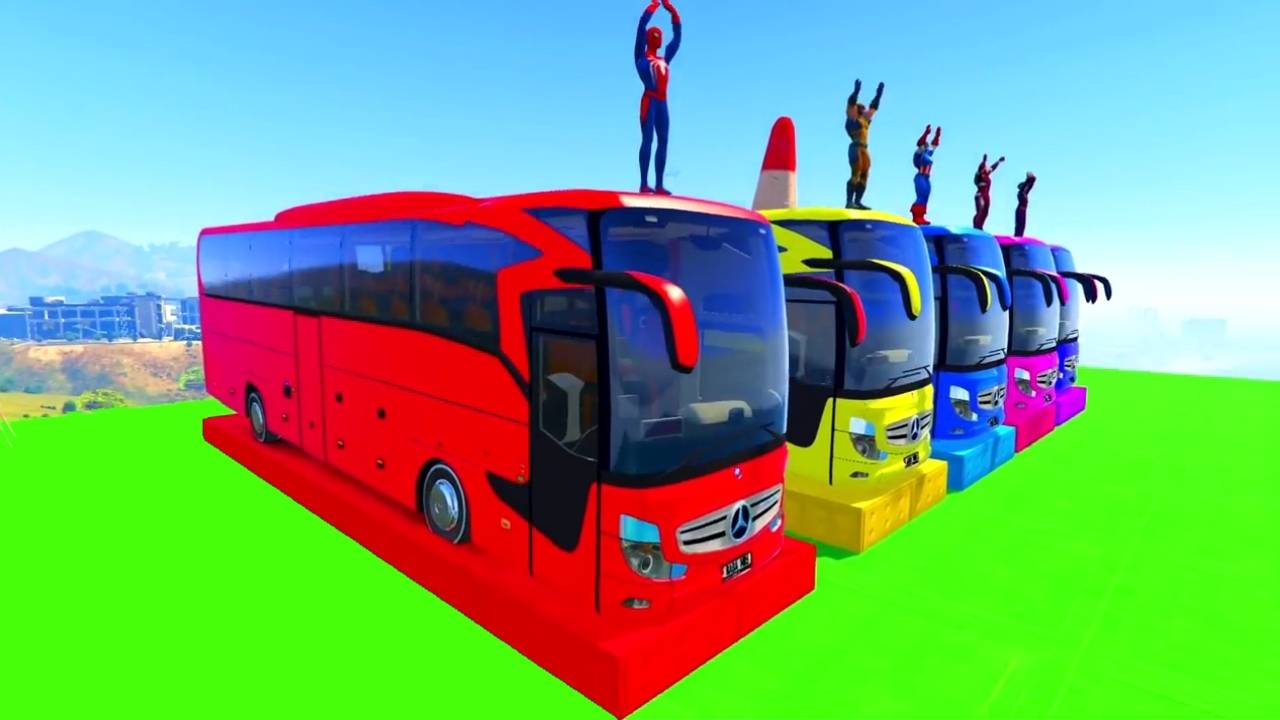 Мультики для детей Человек-паук с Автобусами и Супергероями на полосе препятствий