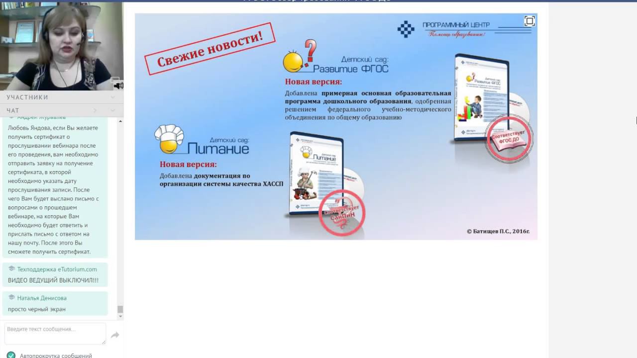 Вебинар для заведующих, их заместителей и медсестер детских садов от Программного центра "Помощь образованию". Тема: Учет развития детей в соответствии с ФГОС дошкольного образования в программе "Детский сад: Развитие ФГОС". Обзор требований ФГОС ДО Дата: 07.04.2016