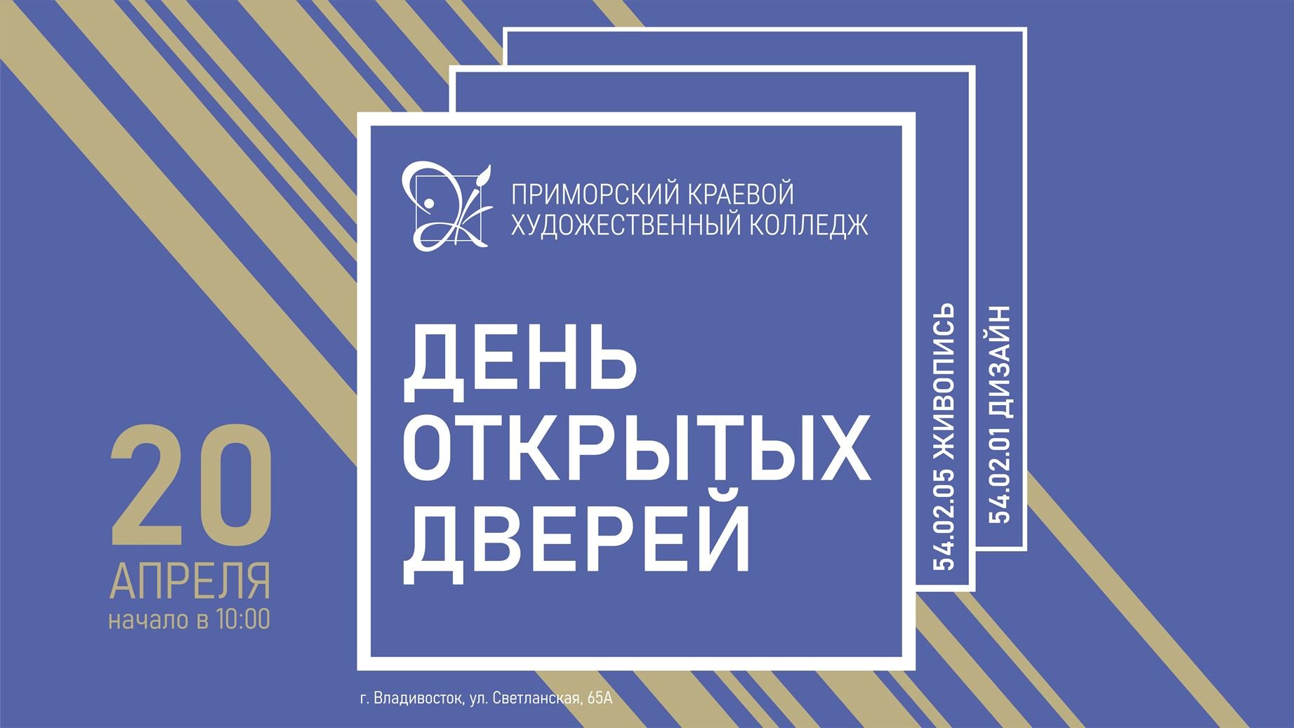 Дорогие друзья! Приморский краевой художественный колледж приглашает абитуриентов и родителей, а также всех желающих на День открытых дверей, который состоится 20 апреля 2022 г. в 10.00.