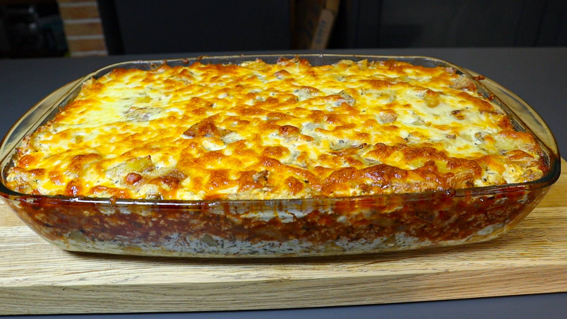 Добрый день! Сегодня мы приготовим вкусный домашний семейный ужин. Рецепт вкусного ужина с макаронами. - 1-1,5 кг картофеля. - соль. - черный молотый перец. - орегано + оливковое масло. - отправляем в духовку на 60 минут при температуре 180°C. - лук. - обжариваем 1-2 минуты. - мясной фарш 700-800 г. - обжариваем 3-4 минуты. - соль + черный молотый перец. - сухой чеснок + итальянские травы. - томатная паста 500 мл. - сливочное масло 40 г. + растительное масло 1 ст.л. . - сушеный чеснок + сушеная петрушка. - Пармезан 1-2 ст.л. + чеддер 60 г. - сливки 20%-ные - 500 мл. - готовьте 5 минут, постоянно помешивая. - моцарелла - 100 г. - поставьте в духовку на 20 минут при температуре 180°C. Наш семейный ужин готов! Если вам понравилось, поставьте лайк, подпишитесь и напишите комментарий!