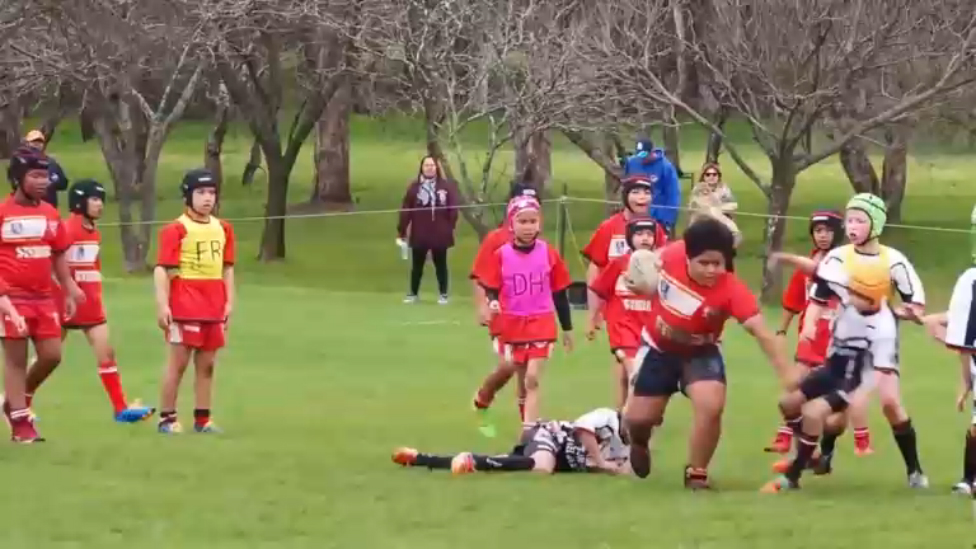 Нарезка действий 9-летнего австралийца Миалофа Тео на турнире по регби в Канберре. Из-за своей комплекции мальчик буквально сбивает с ног соперников и легко убегает от них.