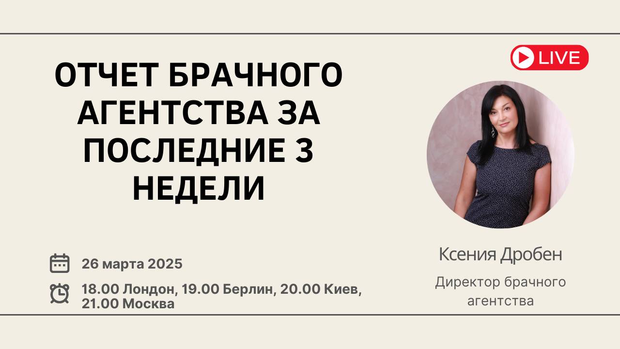 После долгой паузы мы снова входим в рабоче-вебинарный ритм Мой вебинар-отчет состоится сегодня, в среду 26 марта. Я расскажу вам про наши новые и прошедшие мероприятия, поделюсь яркими событиями, отвечу на ваши вопросы Время: 18.00 по Лондону, 19.00 по Берлину, 20.00 по Киеву, 21.00 по Минску и Москве Где: RuTube - https://rutube.ru/channel/24748934/ YouTube Ksenia Droben https://www.youtube.com/@KseniaDrobenPartnervermittlung Страница Facebook https://www.facebook.com/ksenia.droben VK https://vk.com/kseniadroben Instagram https://www.instagram.com/kseniadroben/ - @kseniadroben Tiktok: @kseniadrobendating Если вы не сможете участвовать лично, вебинар можно будет посмотреть в записи Наши ближайшие проекты: 30 марта (воскресенье) – вечеринка знакомств в Кельне https://droben-partnervermittlung.de/ru/single-dating-party-germany-2/ 5 апреля – онлайн вечеринка знакомств https://droben-partnervermittlung.de/ru/dating-event-zoom/ 6-9 июня – Выходные знакомств Love Hotel (Bad Mergentheim) https://droben-partnervermittlung.de/ru/ru-love-hotel/