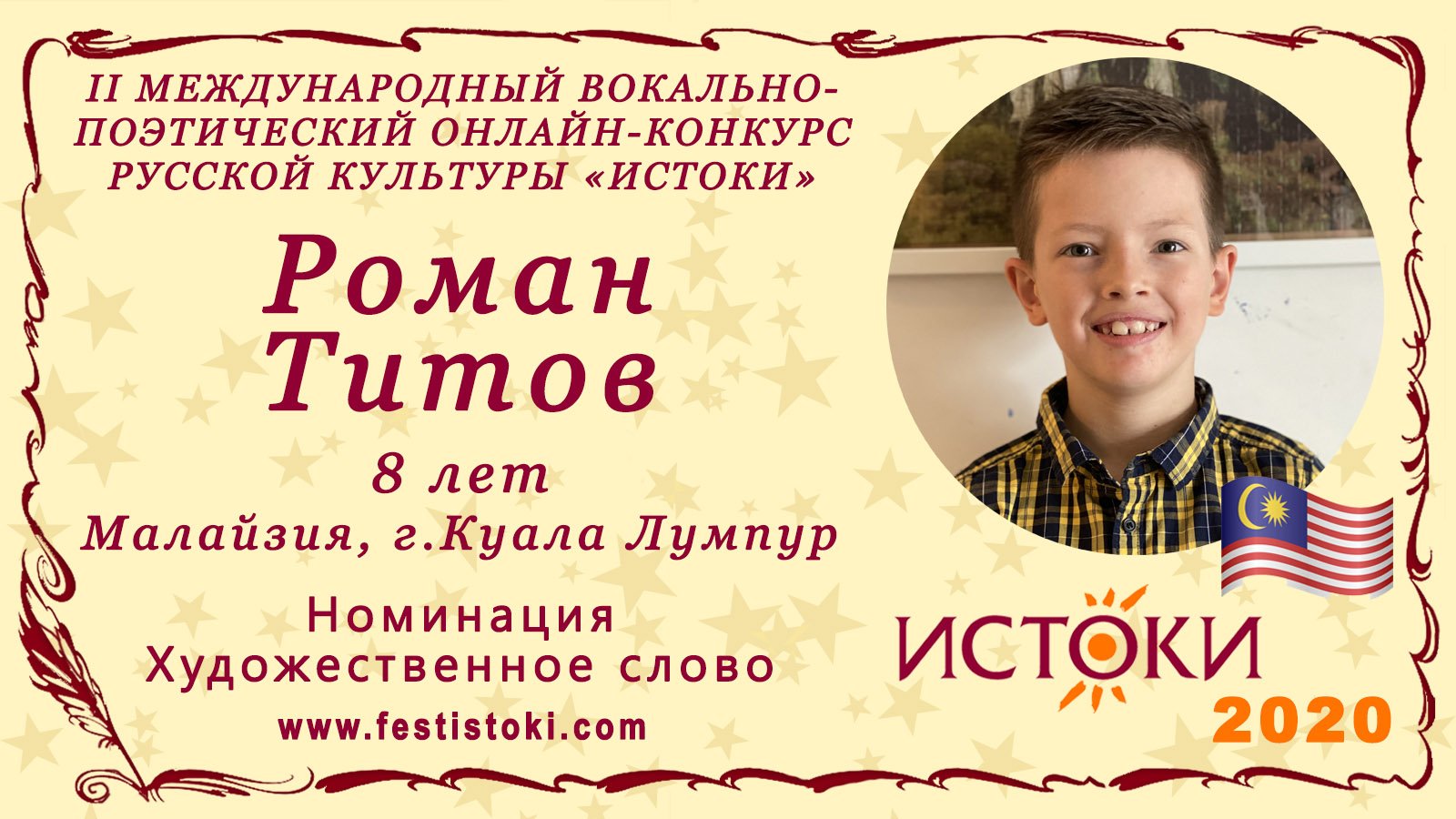Лауреат II степени II Международного вокально-поэтического онлайн-конкурса русской культуры «Истоки». Номинация - Художественное слово. Стихотворение "Тоска по Родине". Автор Евгений Долматовский. Сайт: www.festistoki.ru / www.festistoki.com E-mail: festistoki@mail.ru