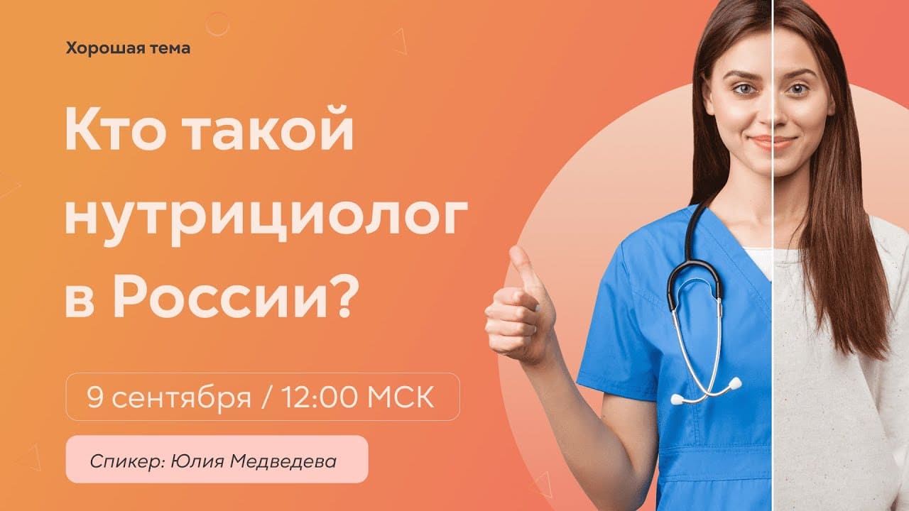 Вебинар: Поговорим о нутрициологии? Скидка на обучение здесь! Мы с отличной новостью! Сегодня выходим с эфиром о курсах профессиональной переподготовки на нутрициолога от Национальной академии медицинского образования имени Н. А. Бородина. Спикер: Медведева Юлия Васильевна, ректор академии. Подарок слушателям вебинара: промокод на скидку 20% за обучение. (Ссылка действует до 16.09.22) https://vk.cc/cgpZCk Во время эфира вы узнаете: - Как регулируется деятельность нутрициологов в России. - Требования к образованию. - Как правильно выбрать курсы. - Особенности программы в нашей академии. - Итоговые документы по окончании обучения. - Стоимость, условия и многое другое. Эфир будет длиться всего лишь полчаса: 20 минут отводится на теоретическую часть, 10 минут — ответы на ваши вопросы. Ставьте напоминание, не упустите возможность начать обучение по выгодной цене! Мы в социальных сетях: Вконтакте - https://vk.com/horoshaya_tema Телеграм - https://t.me/horoshaya_tema