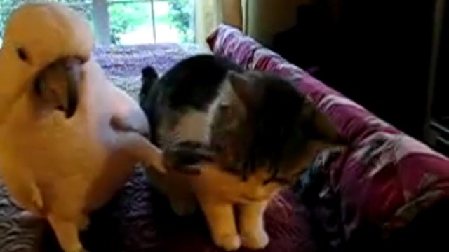 Попугай гладит кошку