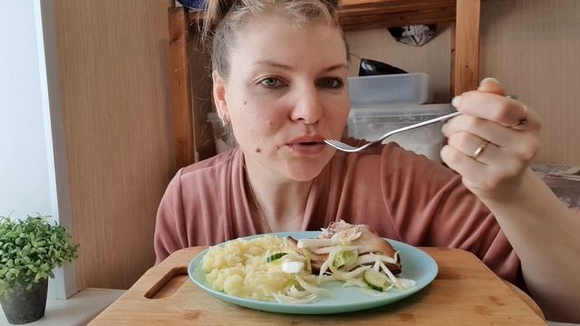 МУКБАНГ. Жареный окорочок, нежнейшее картофельное пюре и салат из пекинской капусты!