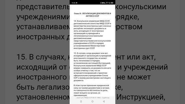 Судебные и нормативные акты РФ https://sudact.ru/law/instruktsiia-o-konsulskoi-legalizatsii-utv-mid-sssr/?ysclid=mkv5oikrit118180617 Актуальные документы по состоянию на: 15 февраля 2026 https://legalacts.ru/doc/instruktsija-o-konsulskoi-legalizatsii-utv-mid-sssr/?ysclid=mlnvpxmkps971910530 Инструкция о консульской легализации (утв. МИД СССР 06.07.1984) Утверждаю Заместитель Министра иностранных дел СССР Н.С.РЫЖОВ 6 июля 1984 года ИНСТРУКЦИЯ О КОНСУЛЬСКОЙ ЛЕГАЛИЗАЦИИ 20. Консульское управление МИД СССР отказывает в легализации доверенностей от имени граждан СССР на ведение имущественных и судебных дел за границей, если такие доверенности нотариально удостоверены без соблюдения требований пункта 185 Инструкции о порядке совершения нотариальных действий государственными нотариальными Глава I. ОБЩИЕ ПОЛОЖЕНИЯ 1. Консульская легализация заключается в установлении и засвидетельствовании подлинности подписей на документах и актах и соответствия их законам государства пребывания. Консульская легализация подтверждает правомочность документов и актов в международном общении. 2. Функции по консульской легализации выполняют: а) за границей - консульские учреждения СССР; б) в СССР - Консульское управление Министерства иностранных дел СССР, дипломатические агентства МИД СССР и министерства иностранных дел союзных республик. 3. В соответствии со статьей 55 Консульского устава Союза ССР в консульских учреждениях СССР функция по легализации документов и актов возлагается на консулов СССР. По поручению консула консульская легализация может осуществляться и другими консульскими должностными лицами. Консул принимает к легализации документы и акты, удостоверенные властями консульского округа или исходящие от этих властей. 4. Организации и учреждения СССР и союзных республик принимают к рассмотрению документы и акты, исходящие от организаций и учреждений иностранного государства лишь при наличии консульской легализации, если иное не предусмотрено законодательством СССР или международным договором, участниками которого являются СССР или союзная республика и государство, от организаций и учреждений которого исходят документы и акты. 5. Легализация доверенностей на совершение всякого рода действий за границей от имени организаций и учреждений СССР, управомоченных совершать такие операции, а также других документов, связанных с деятельностью указанных организаций и учреждений, производится Консульским управлением МИД СССР и консульскими учреждениями СССР. 6. Легализации не подлежат документы и акты, которые противоречат законодательству СССР и союзных республик или могут по своему содержанию нанести вред интересам Советского государства или оформлены с нарушением инструкций, регламентирующих оформление документов, предназначенных для использования за границей, или содержат сведения, порочащие честь и достоинство граждан. Не могут быть легализованы также подлинники и копии следующих документов: советских паспортов, документов о принадлежности к КПСС и ВЛКСМ, профсоюзных билетов, трудовых книжек, военных билетов, удостоверений личности, пенсионных книжек, характеристик, документов об образовании (внутрисоюзного образца), документов загс (внутрисоюзного образца), водительских прав, документов о принадлежности к сословиям и вероисповеданиям, о судимости после установления Советской власти или о реабилитации, о доре