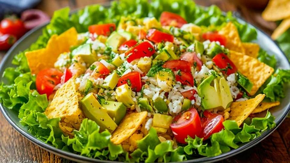 Зеленый салат с авокадо, рисом и чипсами