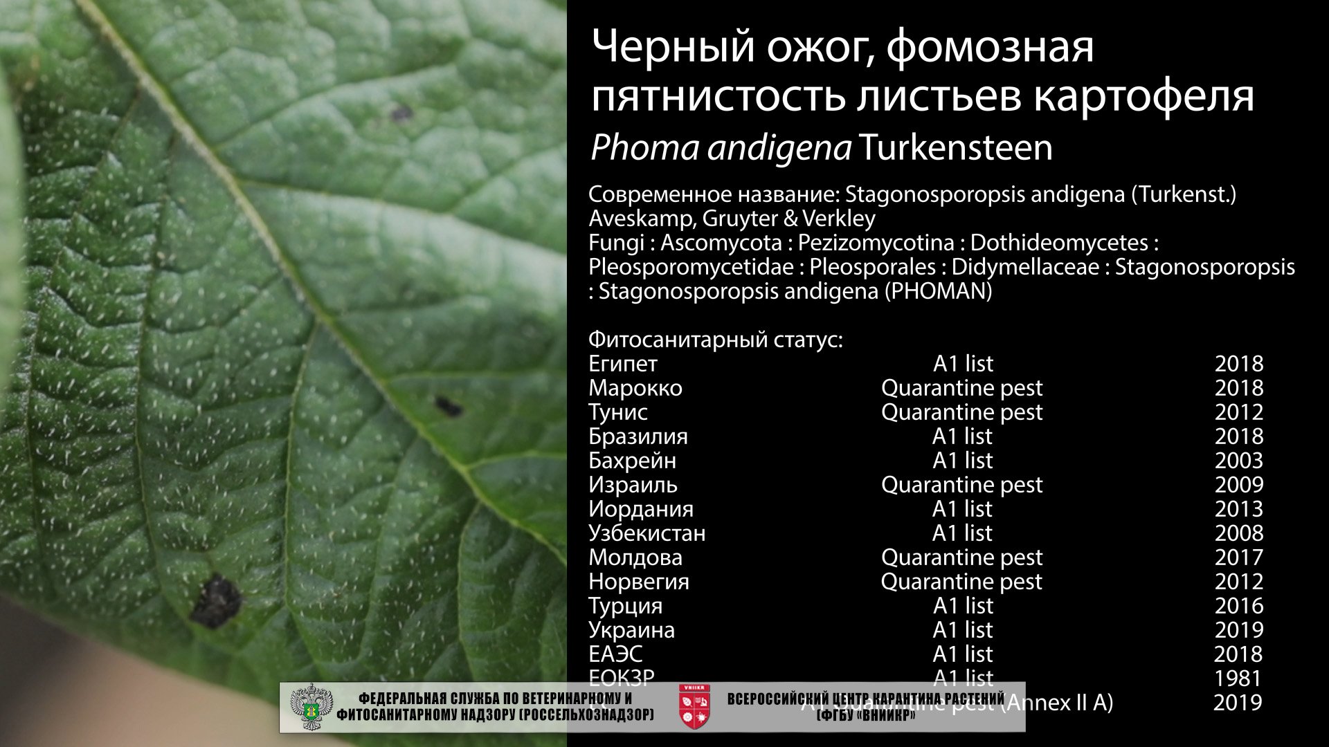 Черный ожог, фомозная пятнистость листьев картофеля, Phoma andigena. Возбудитель заболевания, Stagonosporopsis andigenа, поражает культивируемый картофель, но возможно, и дикие виды картофеля.