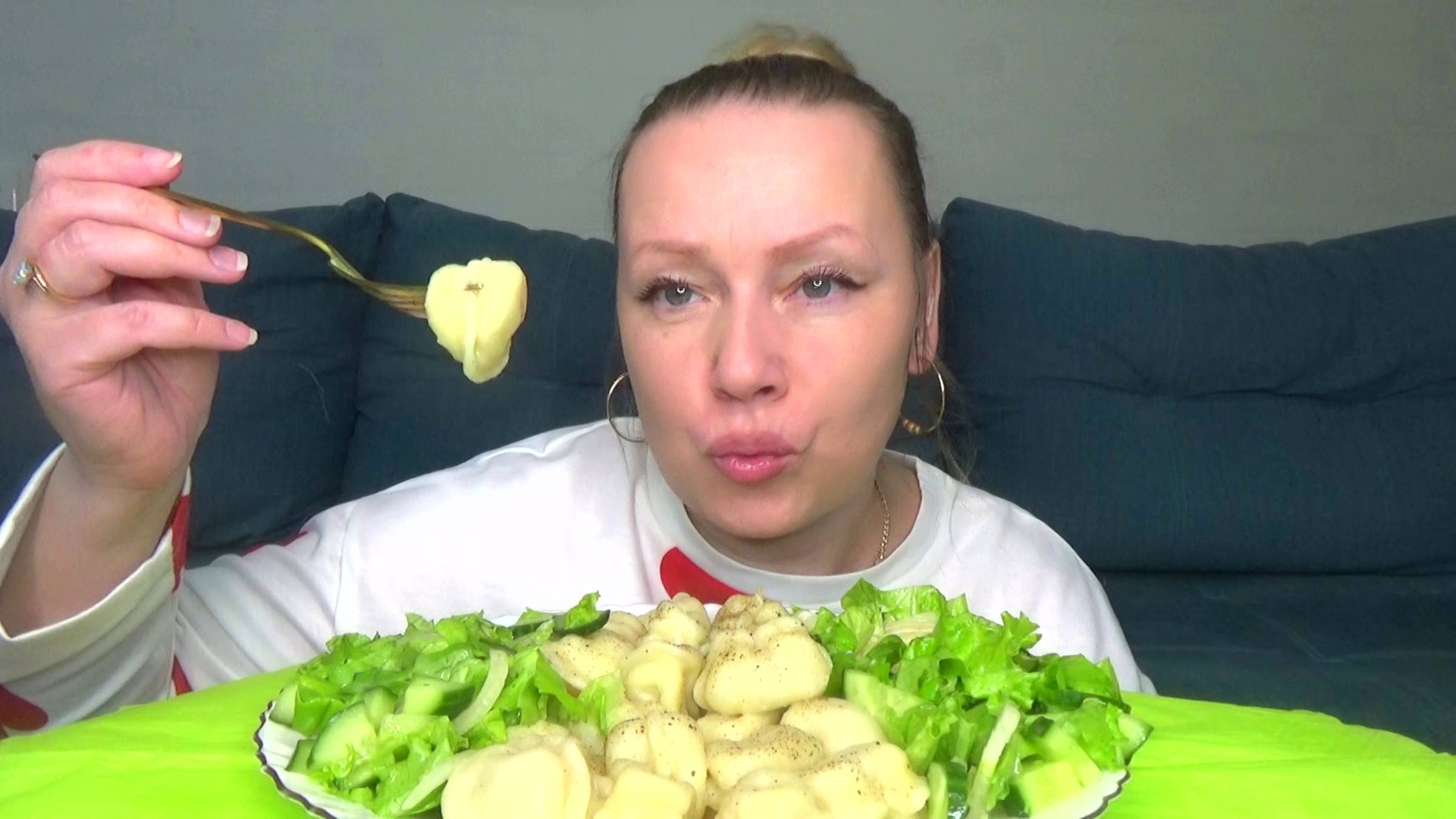 Мукбанг пельмени с мазиком, салатик зеленый овощной. Еда на камеру.