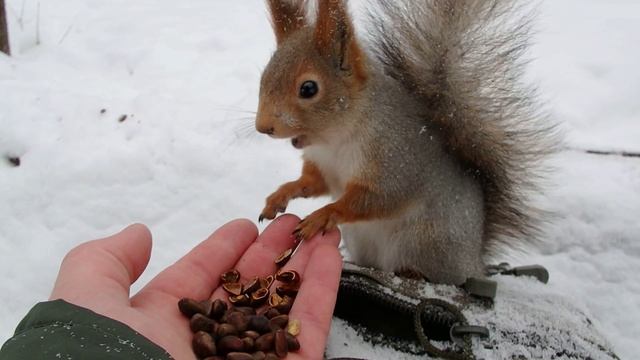 Из-за ворон приходится кормить бельчонка с ладони