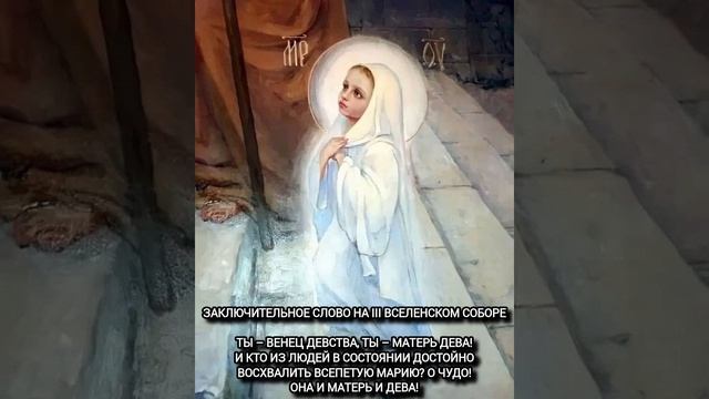 Заключительное слово на III Вселенском Соборе Ты – венец девства, Ты – Матерь Дева! И кто из людей в состоянии достойно восхвалить всепетую Марию? О чудо! Она и Матерь и Дева! Святитель Григорий Богослов: «Если кто не признает Марию Богородицею, то он отлучен от Божества.»