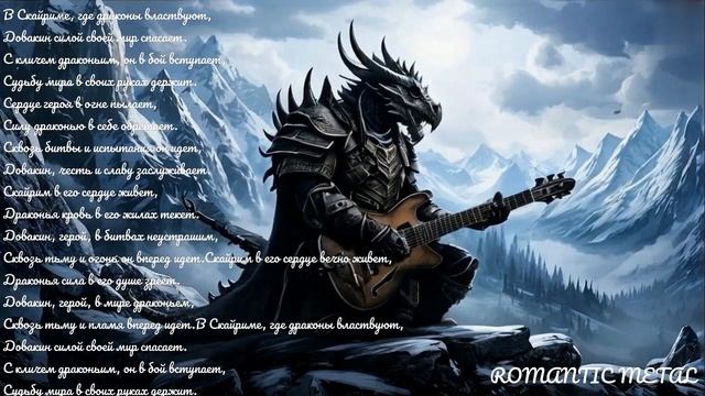 В Скайриме, где драконы властвуют, Довакин силой своей мир спасает. С кличем драконьим, он в бой вступает, Судьбу мира в своих руках держит. Сердце героя в огне пылает, Силу драконью в себе обретает. Сквозь битвы и испытания он идет, Довакин, честь и славу заслуживает. Скайрим в его сердце живет, Драконья кровь в его жилах текет. Довакин, герой, в битвах неустрашим, Сквозь тьму и огонь он вперед идет.Скайрим в его сердце вечно живет, Драконья сила в его душе зреет. Довакин, герой, в мире драконьем, Сквозь тьму и пламя вперед идет.В Скайриме, где драконы властвуют, Довакин силой своей мир спасает. С кличем драконьим, он в бой вступает, Судьбу мира в своих руках держит.