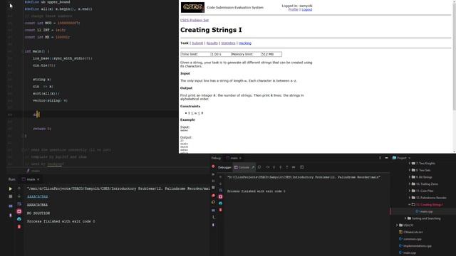 In this video, I solve the problem 'Creating Strings I' from https://cses.fi/problemset/task/1622 Comment any better ideas! The template I use can be found at https://cdn.samyok.us/usaco/template.cpp.txt. I also stream at https://twitch.tv/oksammyoak, so follow me there! I stream everything from web design to Minecraft :) ========================================== Here's the Problem Statement: Time limit: 1.00 s Memory limit: 512 MB Given a string, your task is to generate all different strings that can be created using its characters. Input The only input line has a string of length n. Each character is between a-z. Output First print an integer k: the number of strings. Then print k lines: the strings in alphabetical order. Constraints 1n8 Example Input: aabac Output: 20 aaabc aaacb aabac aabca aacab aacba abaac abaca abcaa acaab acaba acbaa baaac baaca bacaa bcaaa caaab caaba cabaa cbaaa