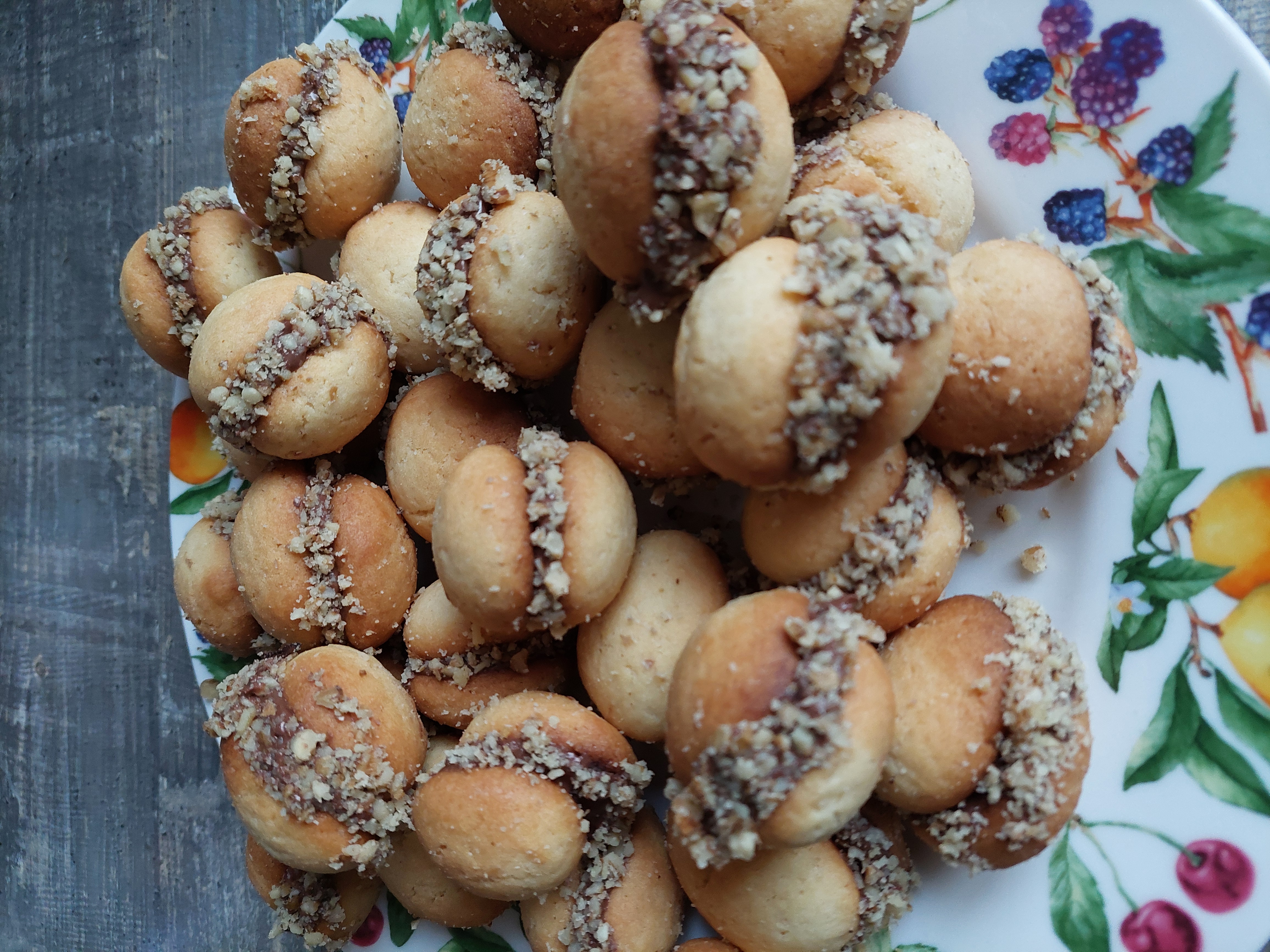 ТЕСТО: • Мука пшеничная - 225 гр • Мука миндальная - 125 гр • Масло сливочное - 250 гр • Сахар - 100 гр • Ванилин -0,5 чл • Разрыхлитель - 1 чл (с горкой) Все ингредиенты перемешать до образования однородного масляного теста. Удобно это сделать с помощью кухонного комбайна. Полученное тесто разделить на 80, примерно равных, частей и сформировать из каждой части лепёшечку. Выпекать при температуре 220 градусов, с конвенцией 8-9 минут. Ориентироваться на свою духовку, выпекать до готовности. Для электрической духовки рекомендую режим "верх - низ". НАЧИНКА: • Шоколадная паста - 5 стл (с горкой) Соединить печенюшки парами, равными по диаметру, шоколадной пастой. ДОПОЛНИТЕЛЬНО: • Грецкие орехи - 100 гр. Измельчить грецкие орехи в крупную крошку. Сформированное печенье обвалять в ореховой крошке по шоколадному шву. ПРИЯТНОГО АППЕТИТА!!!