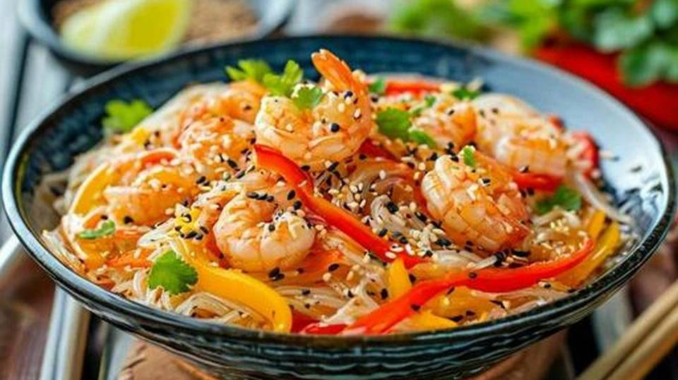 Салат из фунчозы с кунжутным маслом и креветками