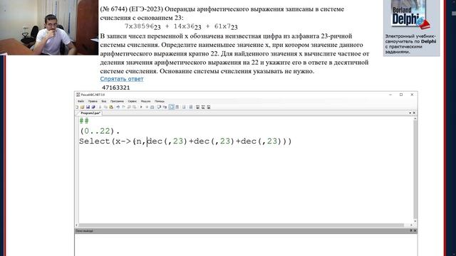 Условия 14.6744: ----------- (ЕГЭ-2023) Операнды арифметического выражения записаны в системе счисления с основанием 23: 7x3859623 + 14х3623 + 61x723 В записи чисел переменной x обозначена неизвестная цифра из алфавита 23-ричной системы счисления. Определите наименьшее значение x, при котором значение данного арифметического выражения кратно 22. Для найденного значения x вычислите частное от деления значения арифметического выражения на 22 и укажите его в ответе в десятичной системе счисления. Основание системы счисления указывать не нужно. ----------- Поддержать проект: https://yoomoney.ru/to/4100117178785043 #информатика #егэ #excel