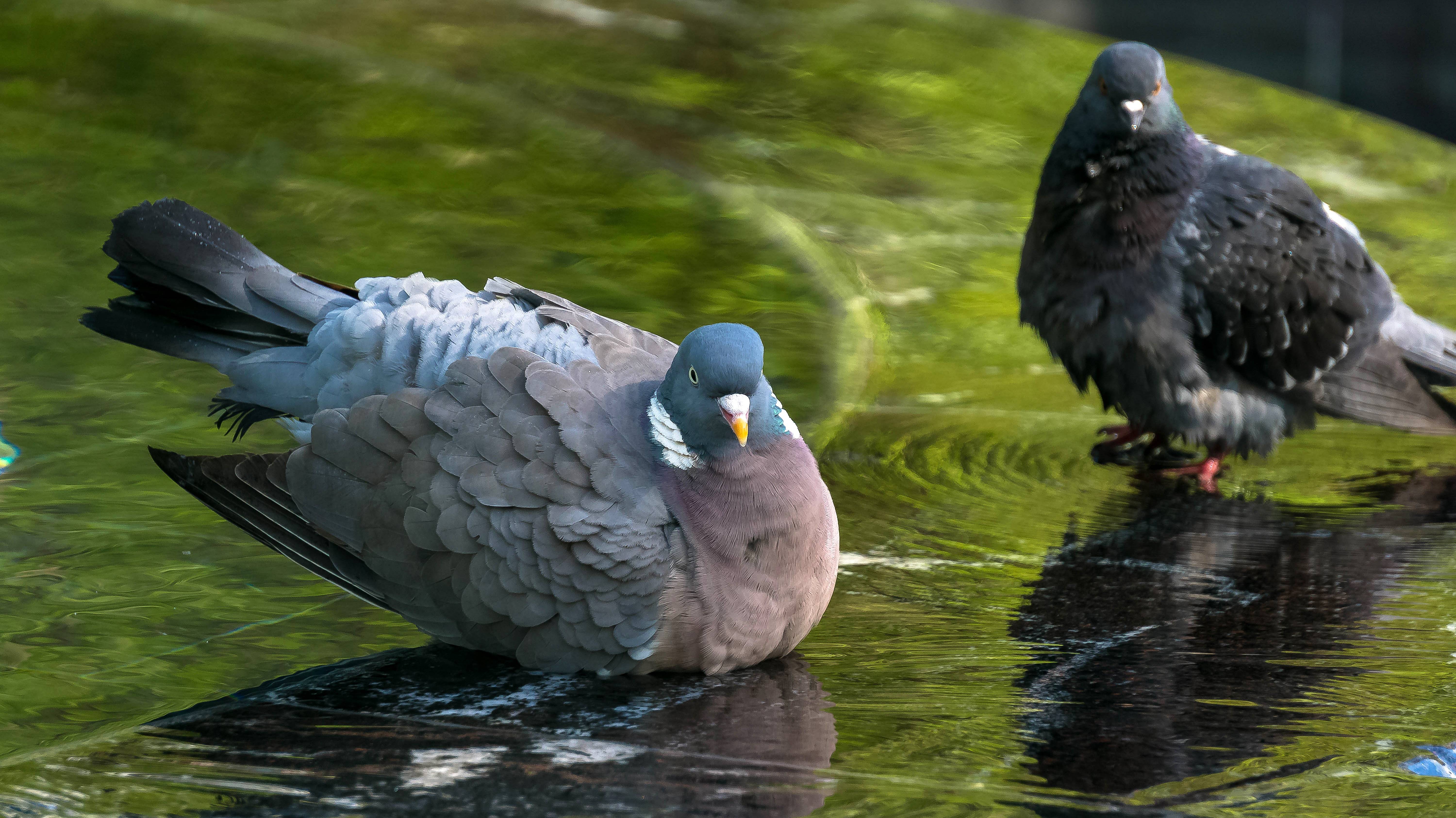 На улице жара, птицы спасаются у фонтана. Примечательно, что лесной голубь в одной компании со своими городскими родственниками. Это большая редкость.