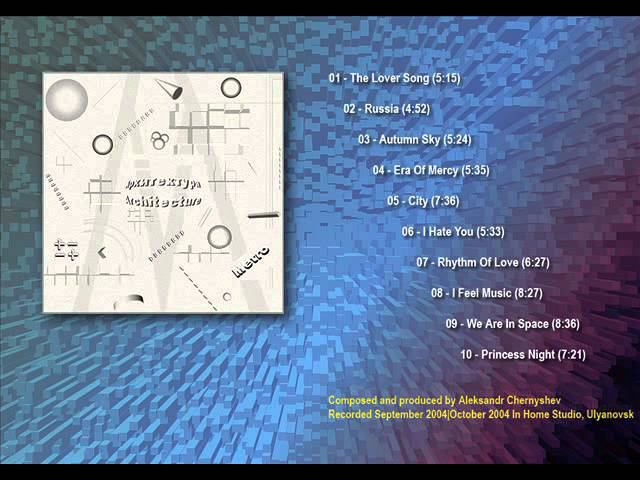Metro - "Architecture" (2004) Композитор и продюсер - Александр Чернышёв. 1. The Lover Song 00:00 2. Russia 05:20 3. Autumn Sky 10:13 4. Era Of Mercy 15:37 5. City 21:13 6. I Hate You 28:49 7. Rhythm Of Love 34:23 8. I Feel Music 40:50 9. We Are In Space 49:18 10.Princess Night 57:55 http://chernyshev-metro.promodj.ru Ульяновск, сентябрь - октябрь 2004 г