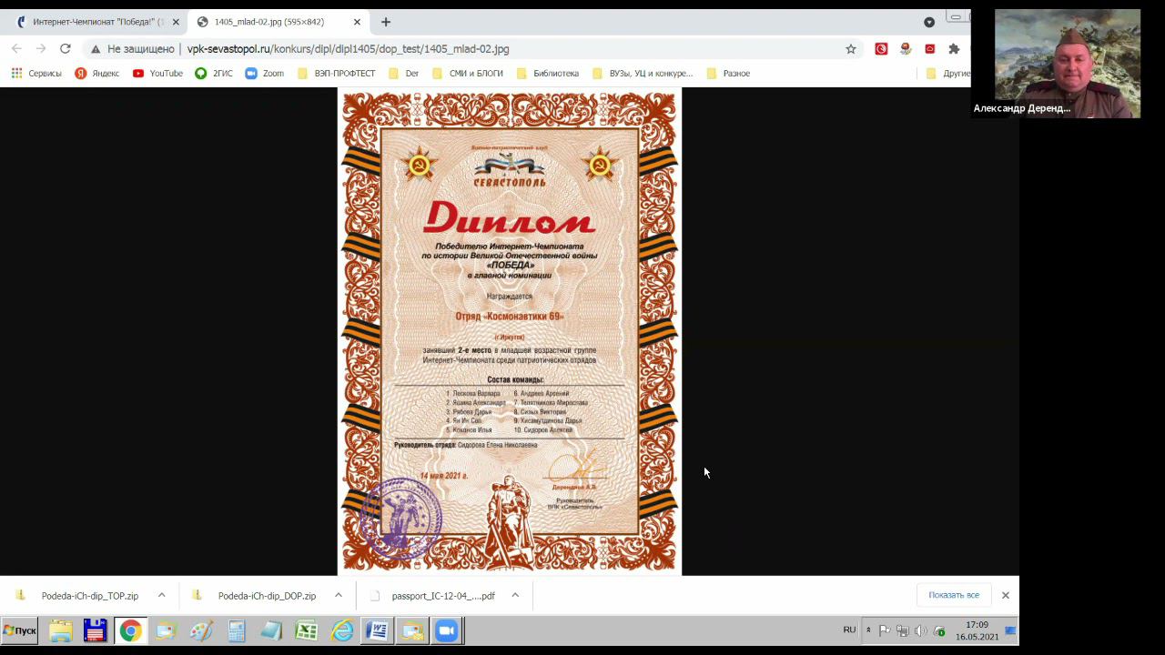 14 мая 2021 года на сайте конкурсов и чемпионатов ВПК "Севастополь" прошел всероссийский Интернет-Чемпионат "Победа" среди патриотических отрядов, посвященный празднику 9 Мая. Очередное онлайн-соревнование на проверку знаний по истории Великой Отечественной войны собрало 54 команды от военно-патриотических клубов, школ, творческих студий и т.д. На мероприятии были представлены 16 регионов России.
