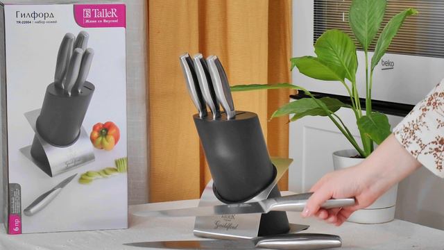 Набор ножей TalleR TR-22004 «Гилфорд» 5 ножей и подставка. Обзор и технические характеристики. Материал подставки — каучуковое дерево и нержавеющая сталь Материал ручки — легированная сталь 420S45 Лезвия ножей сделаны из твердой коррозионностойкой стали AISI 420S45 (3Cr13). Облегченные стальные рукоятки. Состав набора (длина лезвия, толщина лезвия): 🔪нож поварской 20,5 см, 2,5 мм 🔪нож для нарезки 21 см, 2,5 мм 🔪нож универсальный 13,5 см, 2 мм - 2 шт. 🔪нож для чистки 10 см, 2 мм подставка ✅ Стильный дизайн; ✅ Удобство в использовании; ✅ Износостойкие и легко поддаются заточке; ✅ Все ножи удобно хранятся, имеют единый дизайн и не занимают много места; Лезвия не требуют постоянной заточки и легко справятся с любыми задачами: от нарезания фруктов и овощей, до разделки мяса, птицы или рыбы. ❕Рекомендуется ручная мойка. Стоимость на 23.05.2024 - 6 853 р. Подробная информация о товаре https://posudataller.ru/catalog/tr-22004/