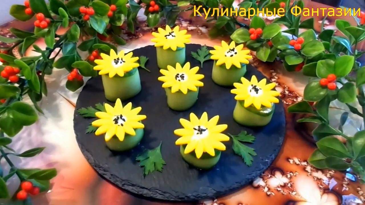 ЗАКУСКА №1 КРАБОВЫЕ ЦВЕТОЧКИ Ингредиенты: Крабовые палочки 3 шт Сыр 30 гр Яйца шт Огурец Тарталетки Майонез Соль, перец Консервированная кукуруза по желанию ЗАКУСКА №2 ПОДСОЛНУХИ Ингредиенты; Сладкий перец четвертинка Сыр 10 гр Творог 50 гр Чеснок 1 зубчик Сметана 3 ч.л Огурец 1 шт Сыр пластинками 2 шт Майонез Кунжут черный ЗАКУСКА №3 ТЮЛЬПАНЧИКИ Ингредиенты: Колбаса 30гр Яйцо 1 шт Сыр 20 гр Огурец 1 шт Тарталетки Помидоры черри Майонез